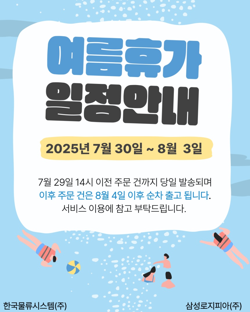 2025년 하계휴무 배송 안내 페이지 정보 작성자 삼성로지피아 댓글 0건 조회 5,588회 작성일 25-07-29 13:10 본문 2025년 하계휴무 배송 안내 목록 이전글 고양시 기업 '삼성로지피아' 유흥식 대표, 우수상(장관상) 수상 다음글 제5회 유통·물류 및 공급망관리 산업전 참가(경기도 킨텍스) 댓글목록 등록된 댓글이 없습니다.